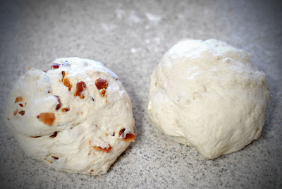 now knead the two together. i know, i know, "why not just knead it all in to one ball of dough at the same time??" i suppose you could, but doing each separately ensures that your crisp, somewhat sharp bacon won't attack and break down your cheese and it means that each bit of this bread will have a special mixed texture and separate tastes that will hit your tongue at different times.